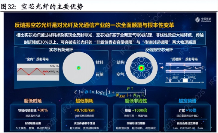 英伟达GB200、Rubin等新一代AI集群,对GPU间通信同步要求达到微秒级,传统实芯光纤光传输速度仅为真空2/3(折射率1.45),时延、非线性损耗直接导致算力浪费;同时传输速率从400G向1.6T/3.2T升级,传统光纤散热、功耗压力剧增,与绿色AIDC要求相悖。