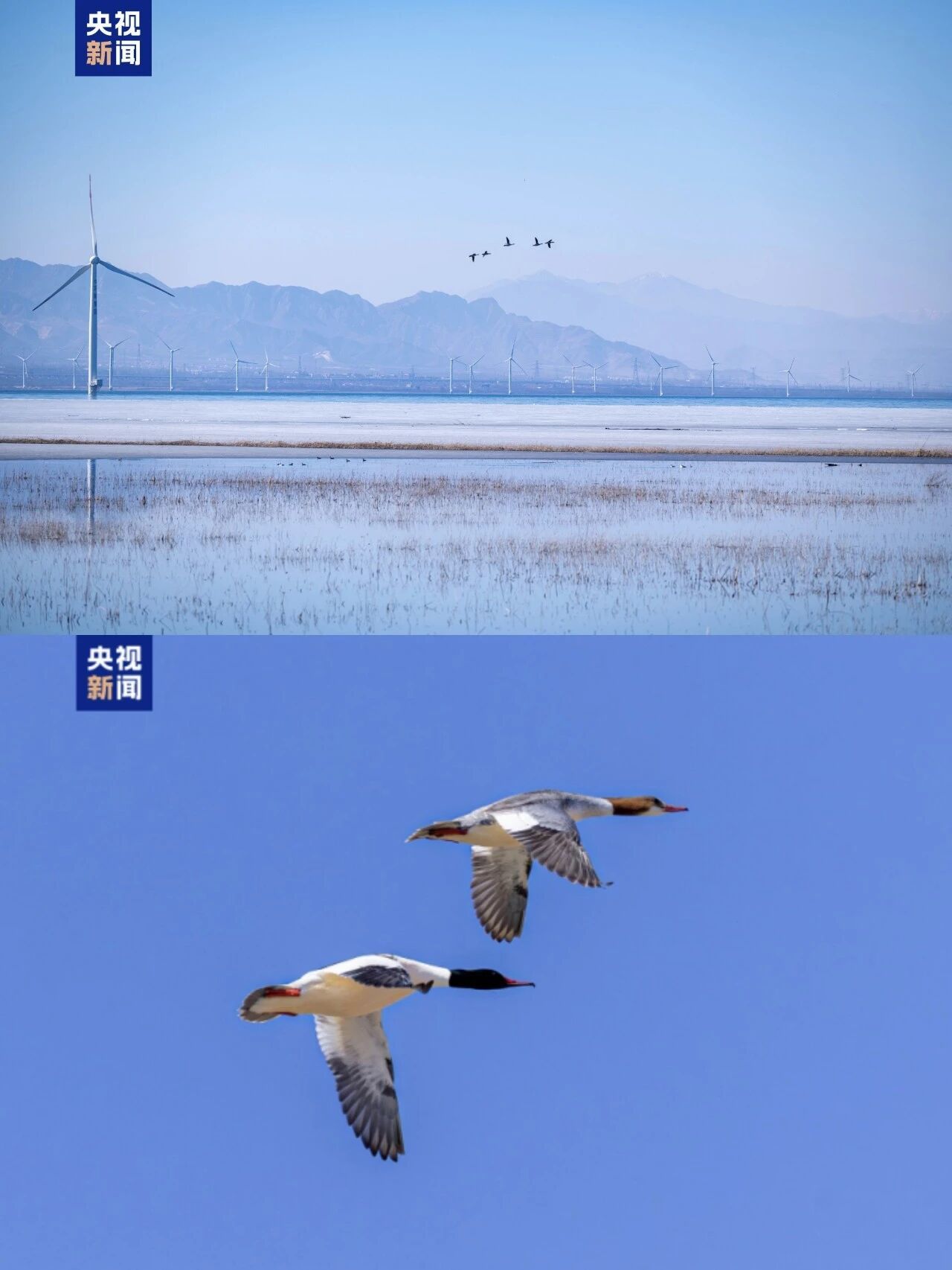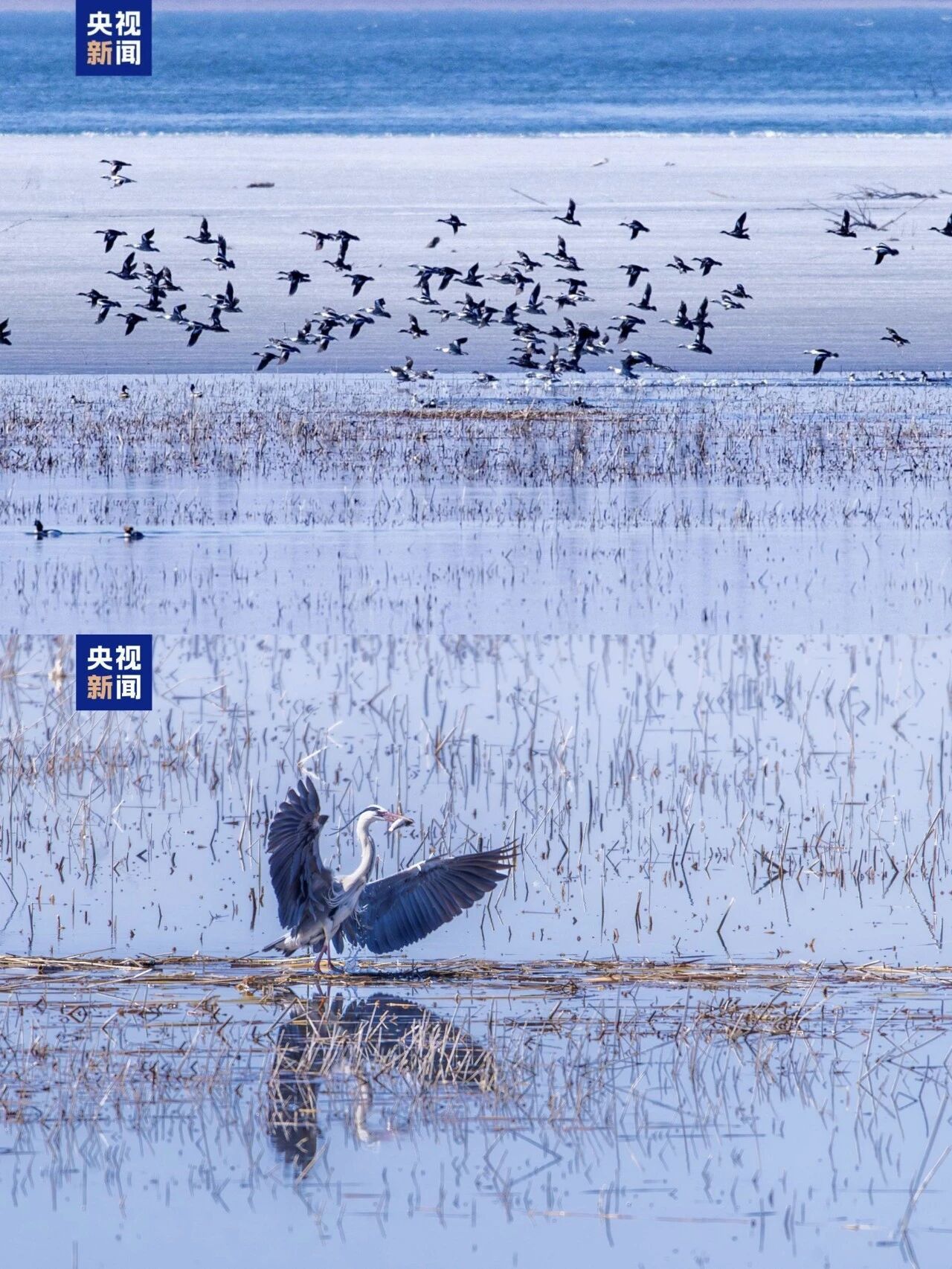 图11-12:春回大地,进入3月中旬,北京野鸭湖湿地即将迎来春季候鸟迁徙高峰,预计届时过境鸟类可达数万只,数十种迁徙候鸟在此停歇补给,形成“万鸟翔集、千羽游弋”的壮观景象。(图/央视新闻客户端)