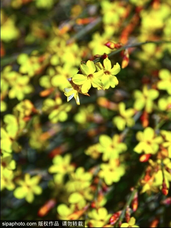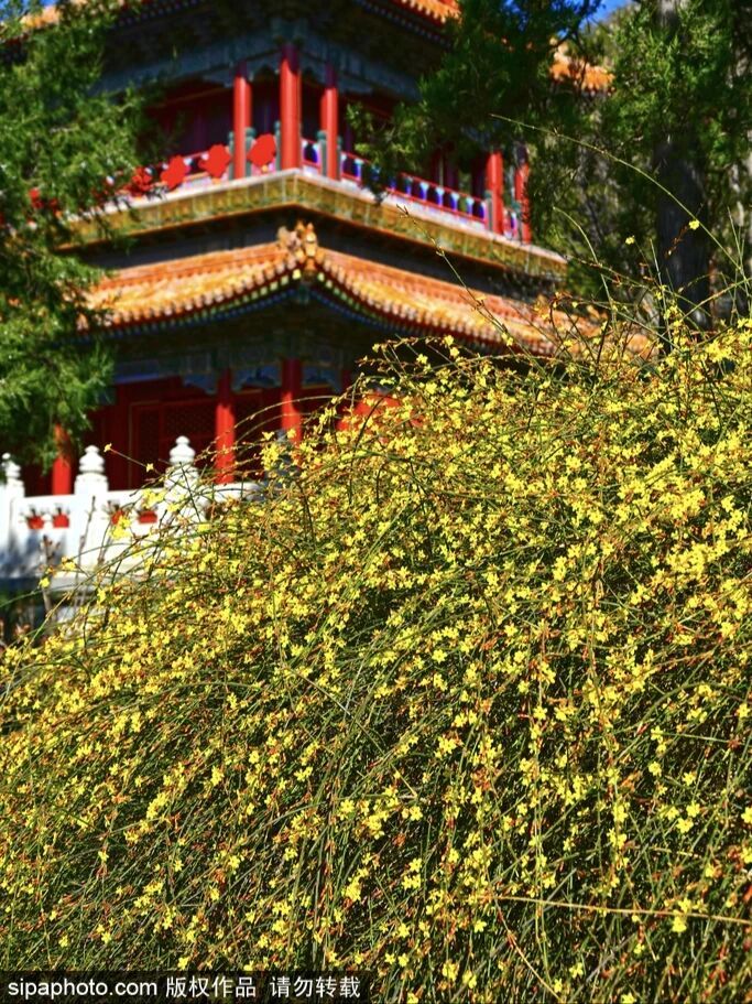 图9-10:近日,景山公园迎春花悄然盛开,春意盎然,与古建筑同框,古韵十足。(图/sipa图库)