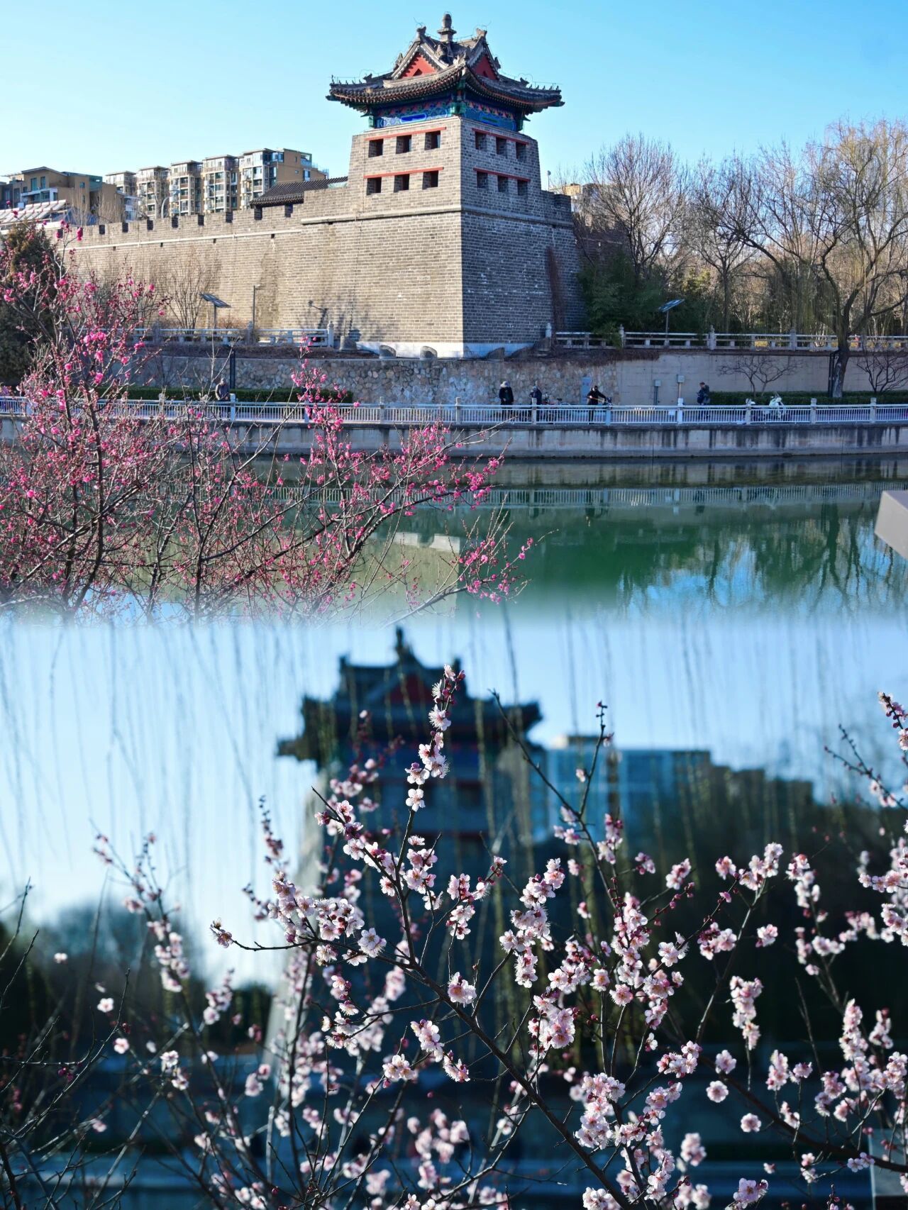 图2-3:3月11日,天气晴好,左安门角楼下,梅花次第开放,市民游客沿着护城河畔的滨水绿道踏青赏景,感受春天的气息。