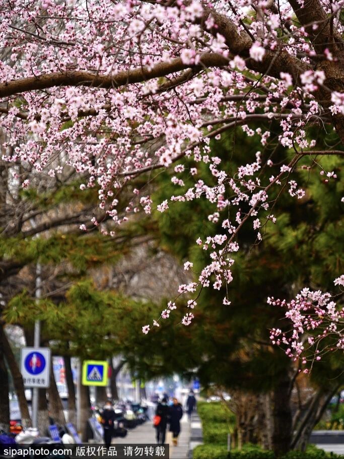 图4:近日,北京宣武门东大街,未英胡同路口的桃花盛开,尽显春日浪漫。(图/sipa图库)