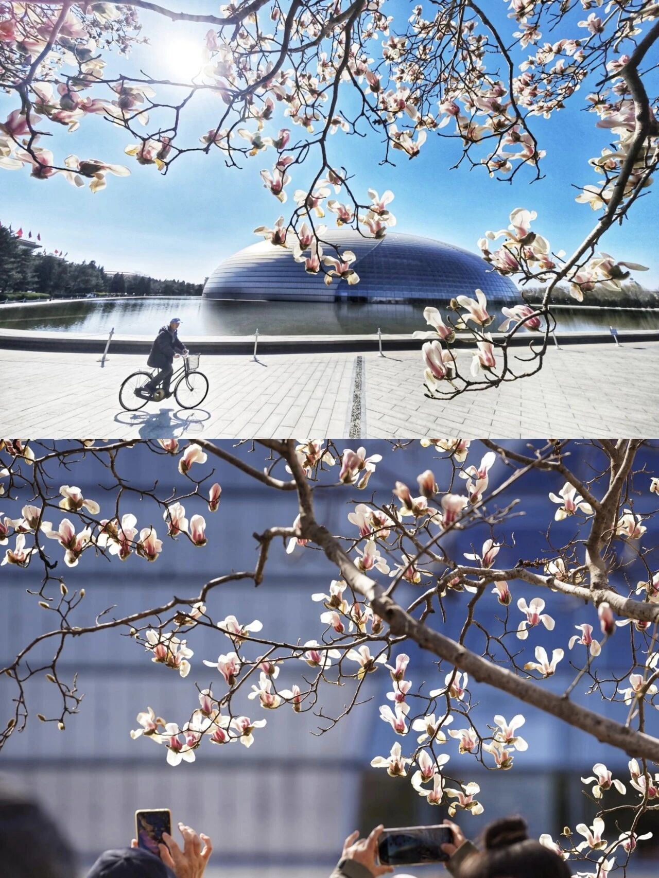 图1:近日,国家大剧院望春玉兰迎来盛花期。洁白的花朵缀满枝头,与剧院现代感的穹顶、水面交相辉映,勾勒出长安街醉人的春景,吸引不少市民、游客前来驻足、赏花、拍照留念。(图/sipa图库)