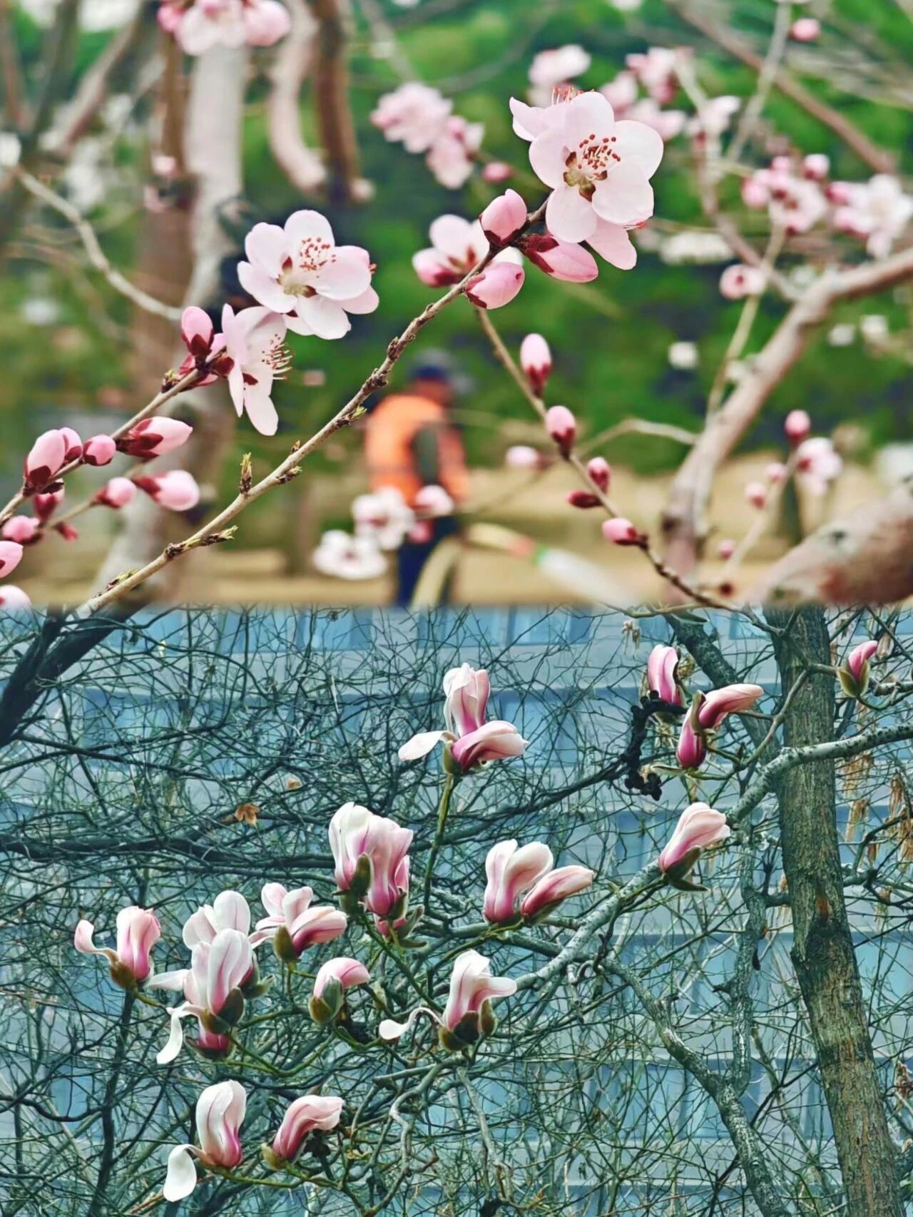 图7-8:近日,城市副中心西海子公园,春色宜人。湖畔柳绿花红,玉兰吐芳,桃花初绽,处处生机盎然。早春玉兰也加入盛放队伍,与远处的燃灯塔相映成趣。(图/北京日报)