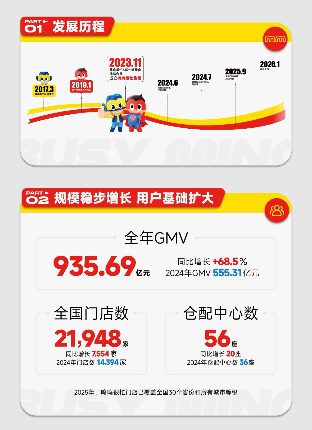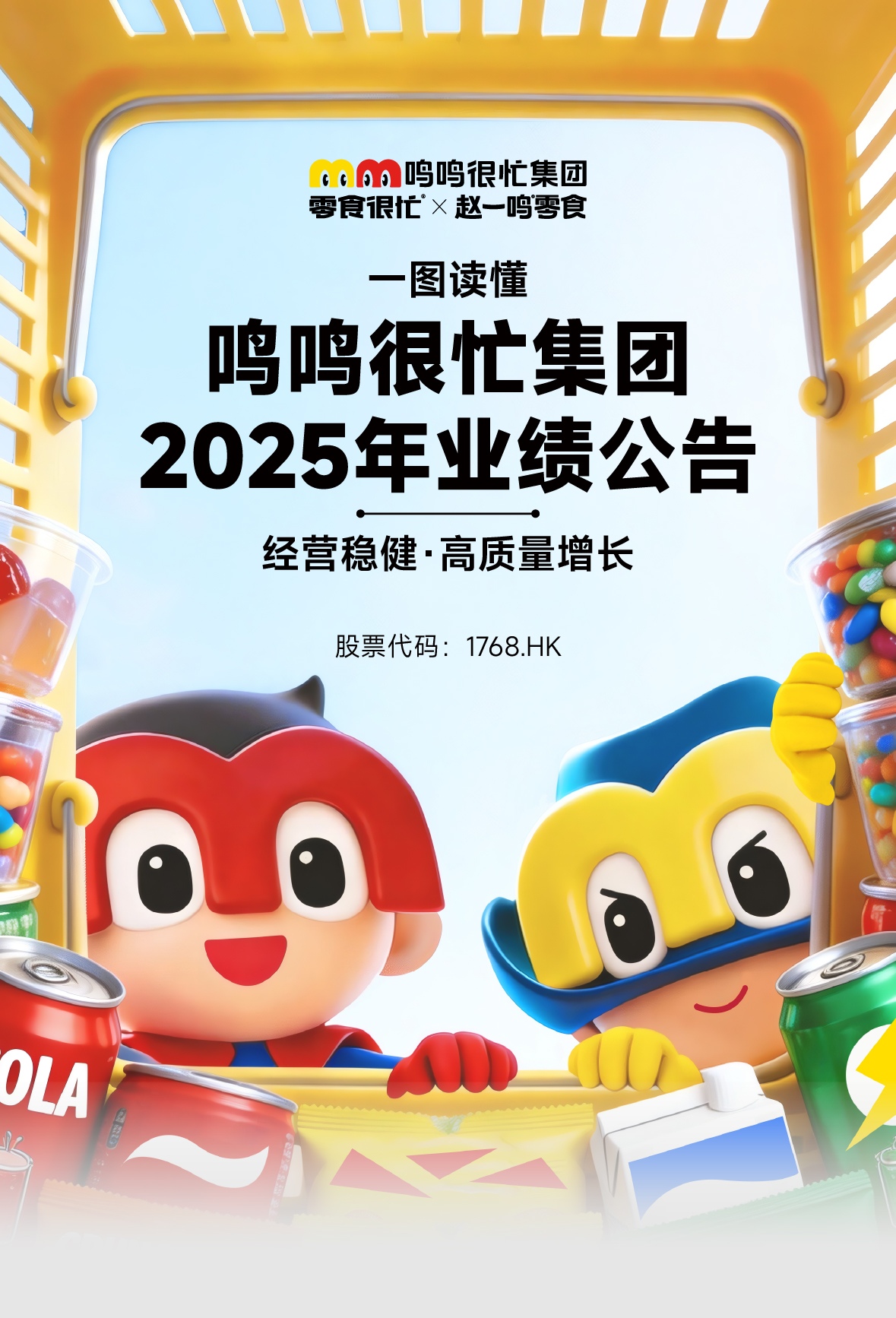 2026年3月31日,休闲食品饮料连锁零售商鸣鸣很忙(股票代码:01768.HK)发布2025年度业绩公告。数据显示,2025年门店商品交易总额(GMV)达935.69亿元,同比增长68.5%;公司实现营业收入661.70亿元,同比增长68.2%,实现净利润23.29亿元,同比增长180.9%,实现经调整净利润26.92亿元,同比增长194.9%。截至2025年末,公司旗下“零食很忙”“赵一鸣零食”门店总数达21,948家。作为港股上市后的首份年度业绩,鸣鸣很忙集团2025年稳健经营与高质量增长并进。