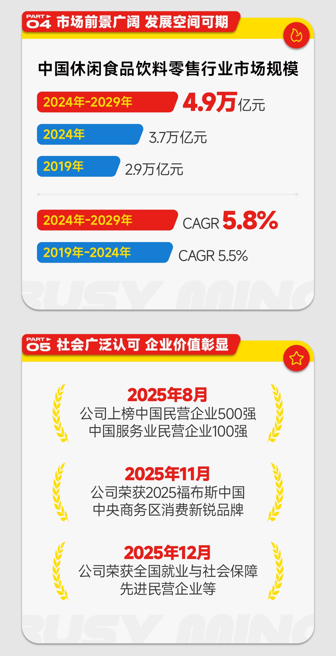 中国休闲食品饮料零售市场空间广阔,行业规模持续增长。根据国家统计局与弗若斯特沙利文的报告,预计2029年市场规模将扩大至4.9万亿元。在万亿规模的行业格局下,具备扎实运营能力和高效供应链体系的头部企业,有望持续获得发展机遇。鸣鸣很忙凭借其稳健增长,正不断巩固行业引领者的市场地位。
